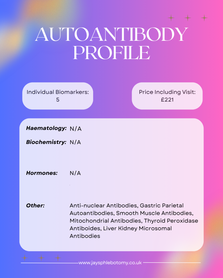 Investigate the underlying causes of unexplained symptoms with our Autoantibody Profile, a specialized diagnostic tool designed to detect signs of autoimmune activity. This advanced screen analyzes 5 critical biomarkers, including Anti-nuclear, Gastric Parietal, Smooth Muscle, Mitochondrial, and Thyroid Peroxidase antibodies, along with Liver Kidney Microsomal antibodies. By identifying these specific immune responses, the profile helps pinpoint potential issues affecting the liver, stomach, and thyroid, providing a vital first step toward a clear diagnosis.